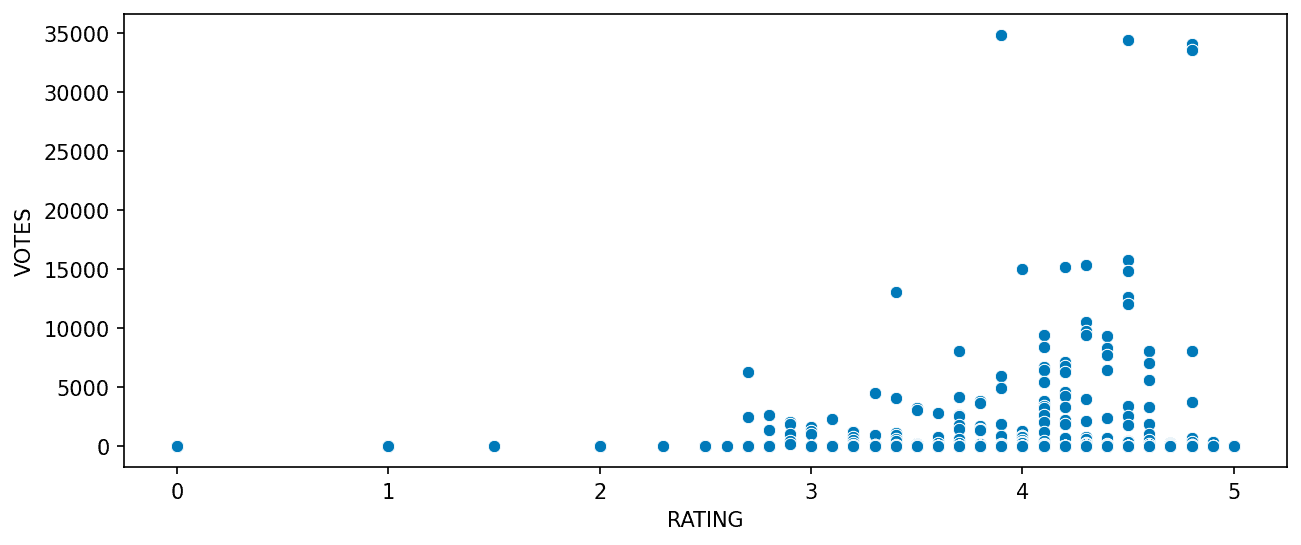 sns.scatterplot(x='RATING', y='VOTES', data=fandango)