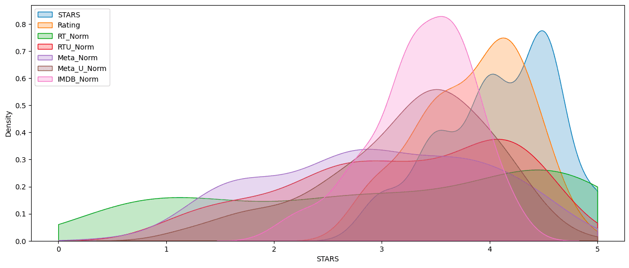 norm_scores.nsmallest(10, 'RT_Norm')[['FILM', 'STARS', 'RT_Norm', 'Meta_Norm', 'IMDB_Norm'|'FILM', 'STARS', 'RT_Norm', 'Meta_Norm', 'IMDB_Norm']]KDE plot of their normalized ratings: