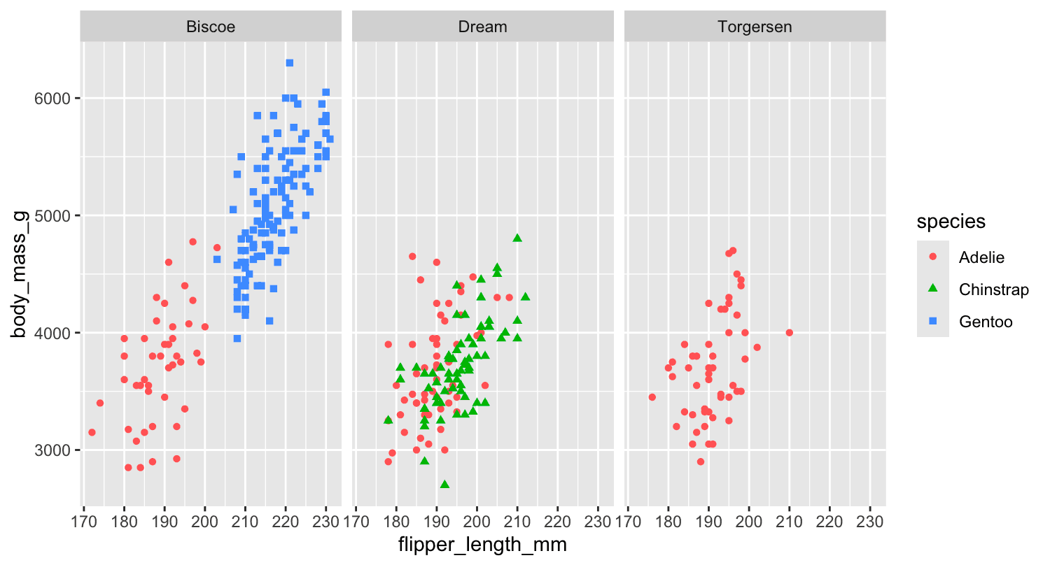 mapping = aes(x = flipper_length_mm, y = body_mass_g, color = island)